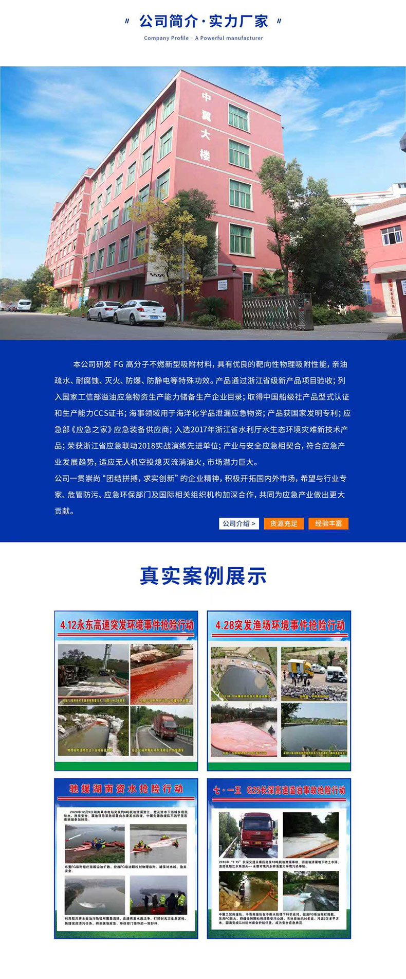 永康市中翼工貿有限公司是國內的專業生產“中翼FG化學危險品吸附顆粒劑(墊)”的中國新型溢油危化品吸附材料企業;獲中國發明專利外觀專利等專利權人許可生產和銷售,受多項知識產權保護。獲我國專業管理機構頒發的產品型式證書和生產能力證書。該項產品的清理水上溢油的良好功能,在2016年杭州G20峰會籌備期間,G25長深高速公路永康段,于7月15日發生的18噸潤滑油泄漏永康江永祥溪重大溢油事故中,發揮了預料不到的優異效果,受到各界好評。我單位參加浙江省2018應急聯動實戰演練活動,受到政府應急管理部門好評,被授予先進單位。