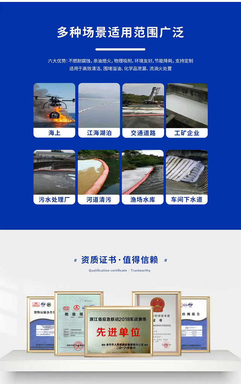 中國發明專利產品:專利號2012 1 01665 0212 /系列產品獲我國專業管理機構頒發的產品型式證書和生產能力證書。浙江省省級新產品。惰性滅火防爆吸附材料,特別針對海岸化危品泄漏設計,適合水上油類、危化品泄漏應急處置以及儲備使用,五大特點,為環保應急處理而服務