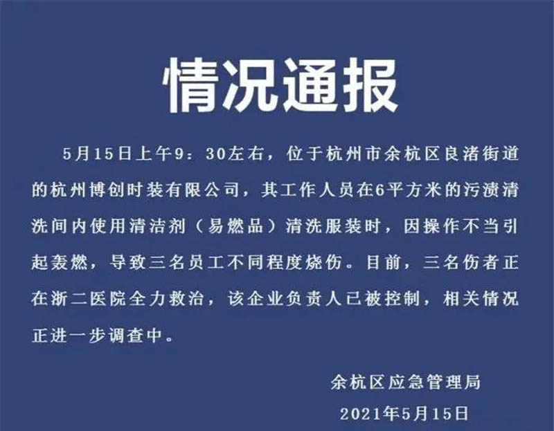 杭州市余杭區應急管理局15日發布情況通報,當日9時30分左右,位于當地良渚街道的杭州博創時裝有限公司,其工作人員在6平方米的污漬清洗間內使用清潔劑(易燃品)清洗服裝時,因操作不當引起轟燃,導致三名員工不同程度燒傷。目前,三名傷者正在浙江大學醫學院附屬第二醫院(下稱浙大二院) 全力救治,該企業負責人已被控制。