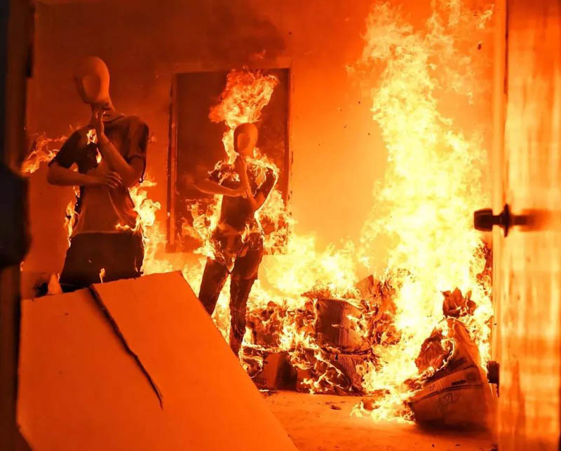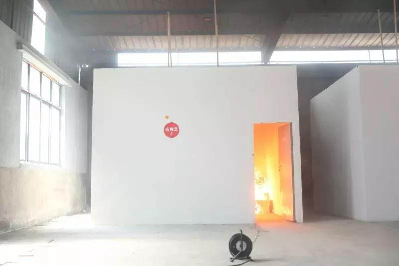 一分鐘后點火命令下達,工作人員打開預設在房間內的電火花遙控裝置,只過了2分11秒,就聽到“轟”地一聲,1號實驗室火光四濺、沖頂而出,房間大半個房頂被掀開。通過監控可以看到,1號實驗室內3名假人身上衣物均過火。