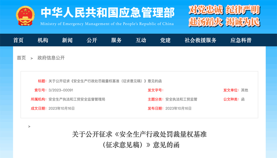 In order to establish and improve the benchmark system of administrative discretion, standardize the exercise of administrative penalty discretion for safety production, and protect the legitimate rights and interests of citizens, legal persons, and other organizations, our department has drafted the "Standard for Administrative Penalty Discretionary Power for Safety Production (Draft for Soliciting Opinions)", which is now open to the public for opinions. The deadline for feedback is November 15, 2023. Please send feedback to your email address aqscfzjs@163.com .