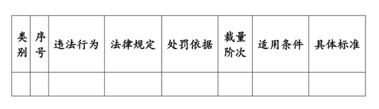 1. Article structure. The discretion rules are divided into six parts, namely illegal acts, legal provisions, punishment basis, discretion order, applicable conditions, and specific standards. The basis for illegal acts, legal provisions, and penalties mainly refers to the original provisions of the law. According to the specific content of the law, illegal acts are classified according to different standards, and the order of discretion, applicable conditions, and specific standards are determined. The specific format is as follows: