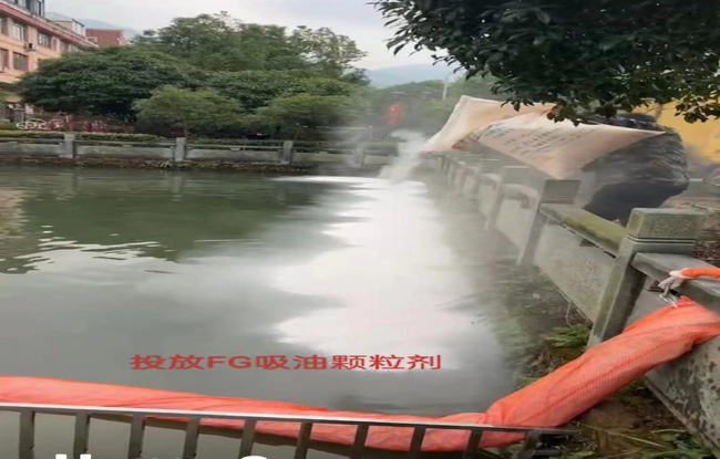 立即采用物理吸附環保模式,開展水上清污作業。首先從池塘出口處布放吸油拖欄,有效阻截水面污染物向下游擴散。同時往水里拋散潔白的FG吸附顆粒劑進行吸附。為了防止化學物質滲透蔓延,董隊又建議將FG吸附顆粒留置在池塘水面,隔日打撈。