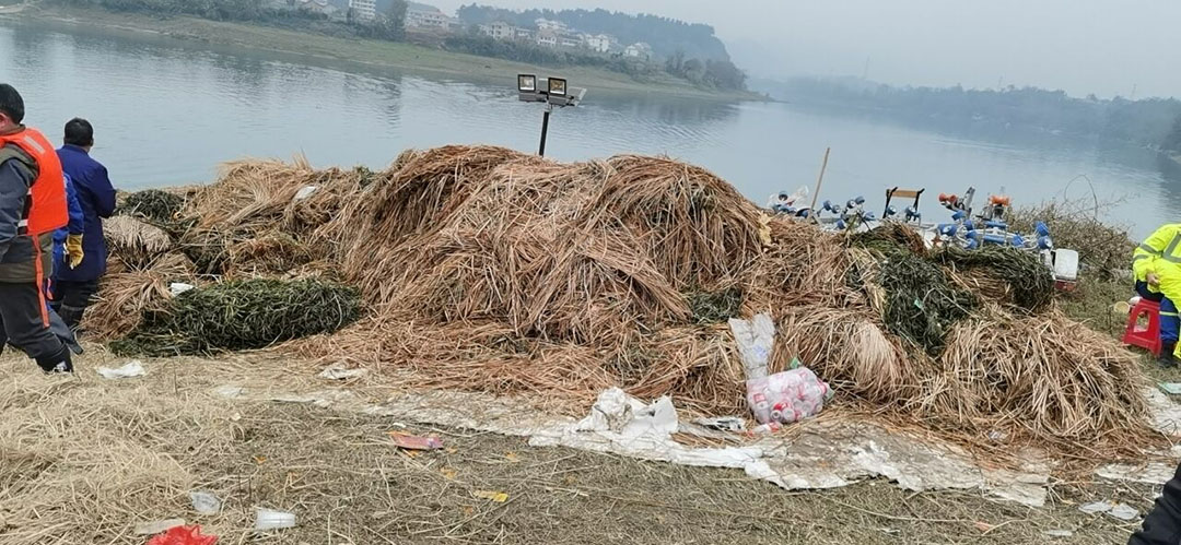 原分散水面油層吸附飽后聚集一塊,13日一早全體隊員集中精力分區塊將其打撈上岸,化解次生水環境災害事故風險,保障下游兩岸居民生活飲水的安全。