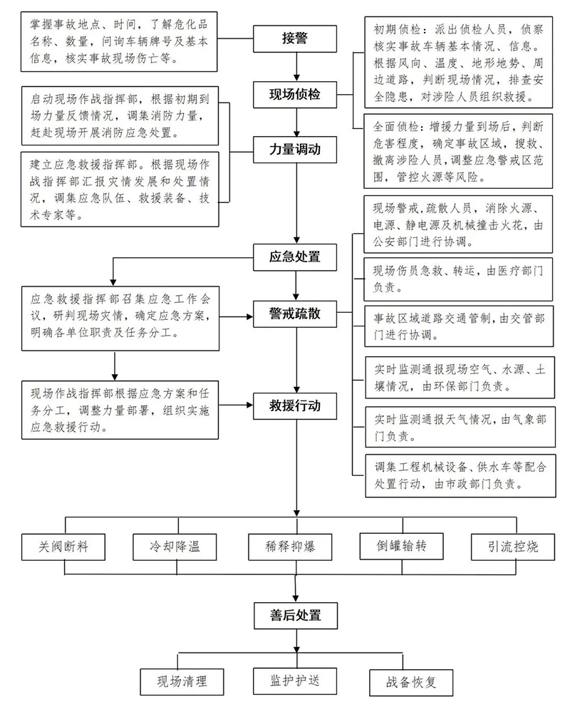 統計數字顯示,我國95%的危險化學品涉及異地運輸問題,由此引發的公路運輸事故占到了危險化學品事故總數的30%-40%,裝運危險化學品的槽(罐)車在其中占了絕大多數。一旦發生危險化學品槽(罐)車運輸事故,應按照以下流程和措施進行應急救援處置,處置中需要落實以下注意事項和防護要求: