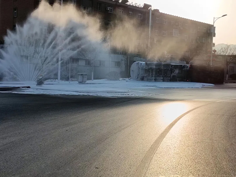 6.壓縮氣體、液化氣體罐車事故,禁止向安全閥等安全附件部位和罐體進行射水,防止安全附件結冰失效或罐體內壓升高造成次生事故。