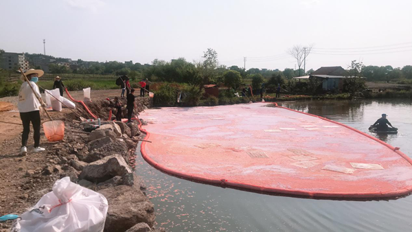 救援隊員們緊張而有序地開展救治,采用一百多米長具有自吸功能的物理吸附拖欄,先將魚塘大范圍水面溢油油漬圍堵起來。然后逐漸圍攏到便于操作的塘岸邊,往漂浮在水面的拖欄內,傾倒撒布,中翼公司生產的FG吸附夥粒。此時吸附顆粒在水中迅速趨向油污,白色顆粒吸飽了油污后變褐紅色。救援隊隊員站在岸邊,再用特制的撈戽,將吸油顆粒撈起來,裝入回收袋上岸的吸油顆粒,無糊狀油漬及水滲出,運回公司進行無害化處理。用了7個多小時連續作業,魚塘清污工作于下午17點勝利結束。徹底將魚塘里的油漬全部物理吸附。視覺觀察水面沒有任何油漬膜存在了。塘里的水也相當于做了一次凈化。沒有受到油污的不良影響,魚兒歡快地躍出水面,此次救援活動,保護了約六畝魚塘水域環境及魚類安全。