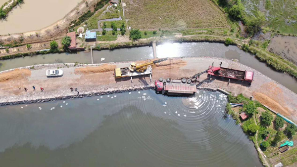 中翼先鋒救援隊在4月28日上午10點左右,接到永康市漁政執(zhí)法中隊徐隊長電話通知:立即趕往方巖鎮(zhèn)皮店村,運沙卡車側(cè)翻在池塘旁邊現(xiàn)場,運沙卡車側(cè)翻造成油箱里柴油泄漏,流入魚塘里危及水域。