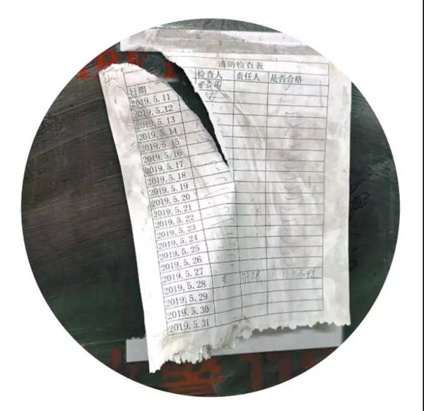 檢查人員提出,讓企業(yè)員工演示倉(cāng)庫(kù)起火后的操作。沒(méi)想到,員工打開(kāi)消火栓后,水壓不足,從水管?chē)姵龅乃\洘o(wú)力、射程不合要求。經(jīng)實(shí)地查看,檢查人員發(fā)現(xiàn)有的消火栓早已銹蝕,有一個(gè)消火栓上面覆蓋著一層厚厚的灰塵,其檢修記錄單顯示近一次檢修時(shí)間是2019年5月。